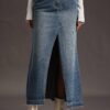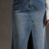 Fustă din denim albastru, lungime maxi, cu șliț frontal adânc ce alungește silueta și oferă libertate de mișcare. Talia înaltă și croiala dreaptă subliniază zona taliei, iar tivul raw (nefinisat) adaugă un accent modern. Buzunare funcționale, închidere cu nasture și fermoar – perfectă pentru ținute casual-chic, de la pulovere tricotate la cămăși albe.