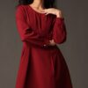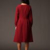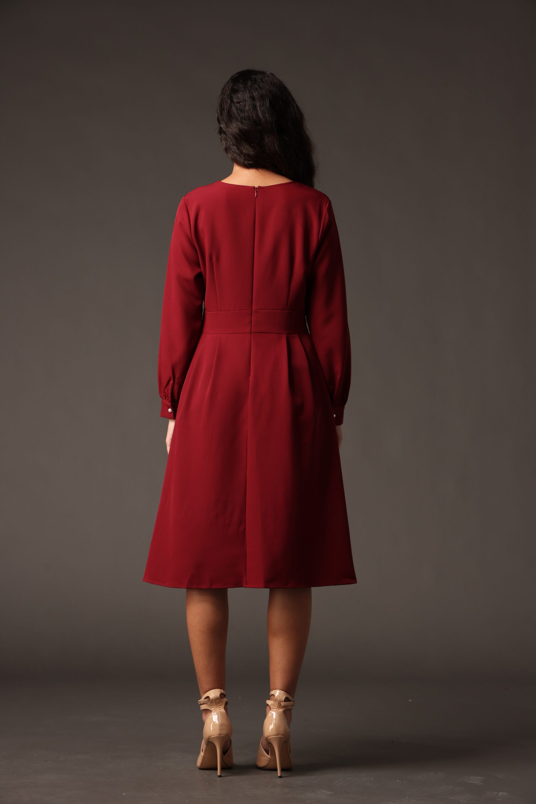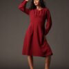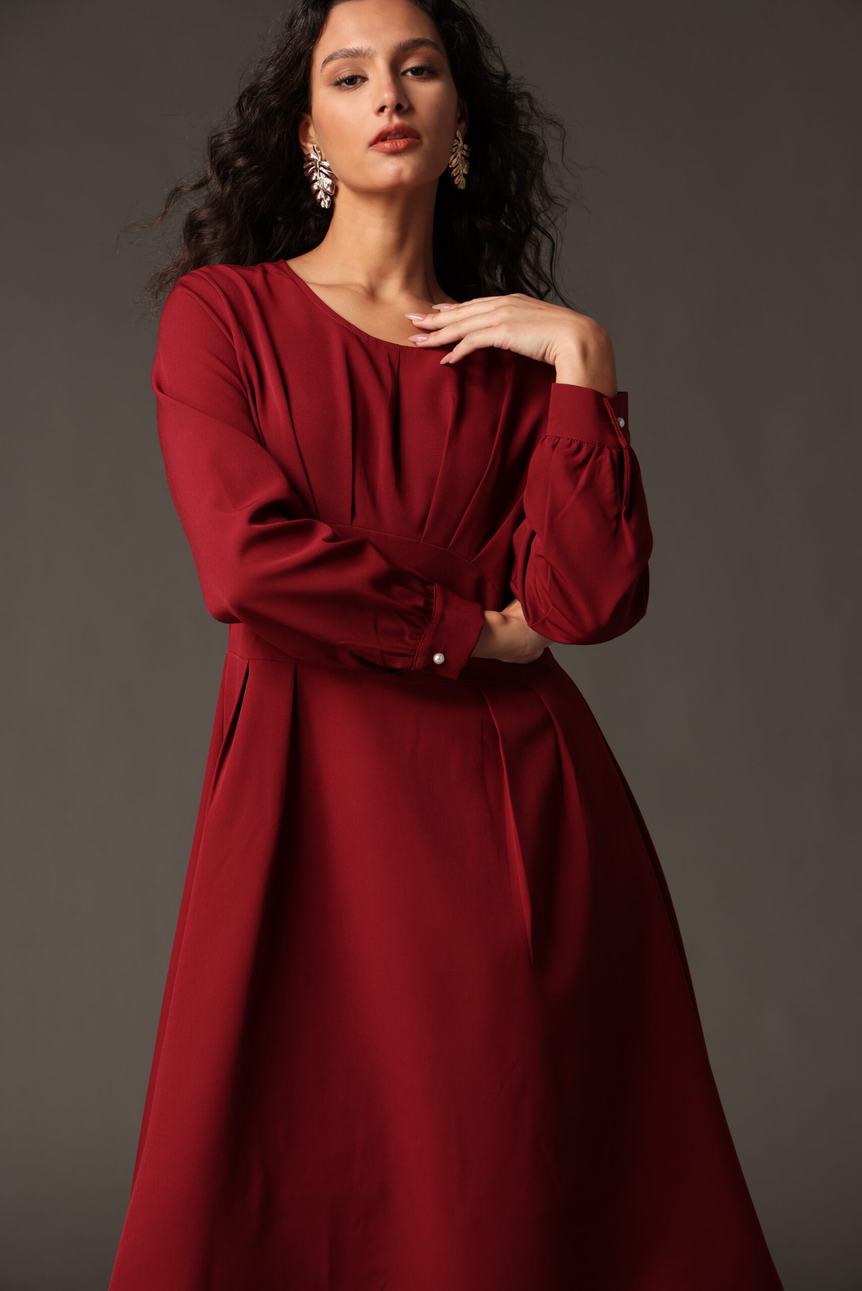 Rochie midi bordo cu siluetă feminină și talie marcată, realizată din material fluid cu cădere frumoasă. Pliurile fine din bust și fusta lejer evazată asigură un plus de volum controlat, în timp ce mânecile lungi o fac potrivită pentru sezoanele mai răcoroase. O alegere versatilă pentru birou, ocazii smart-casual sau evenimente de seară.